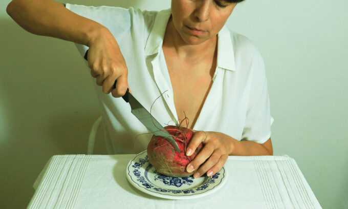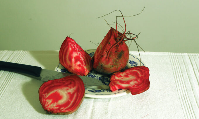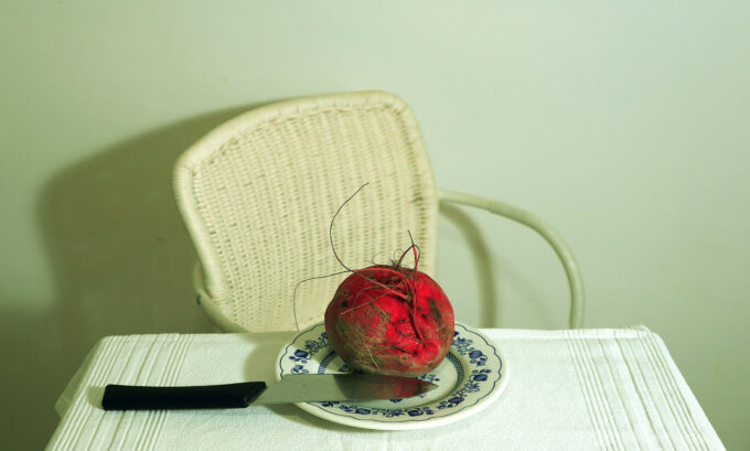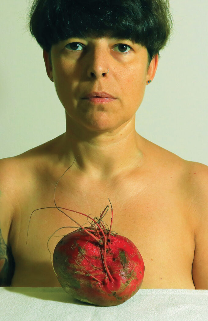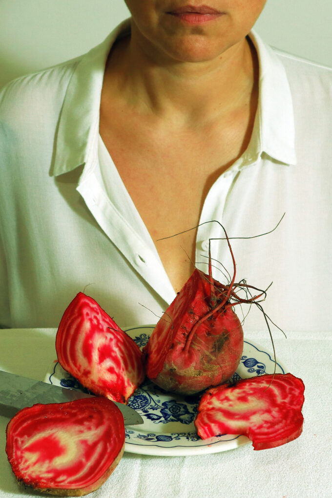 L’evocativa forma di questa radice carnosa , il cui nome scientifico è Beta vulgaris, ha creato immediatamente nell’artista la visione di un cuore umano, fotografato in primo piano , comparso fuori dal petto e presentato su un piatto, come nelle immagini sacre dei martiri, ma artefice del martirio.