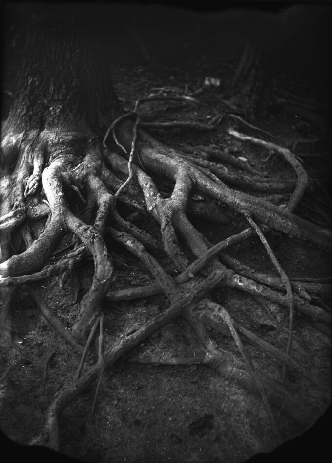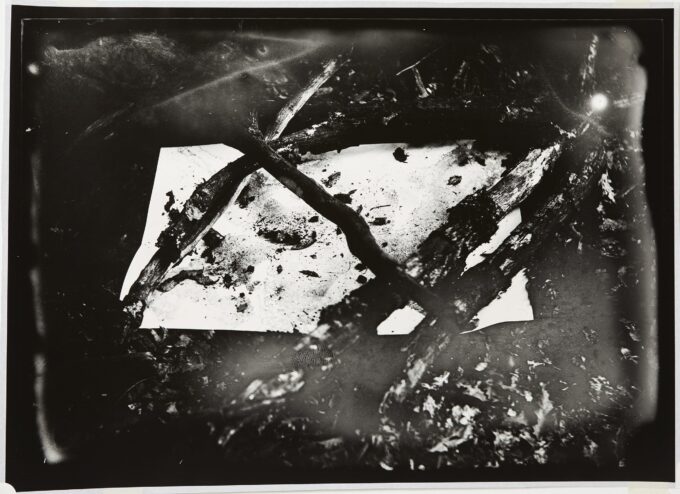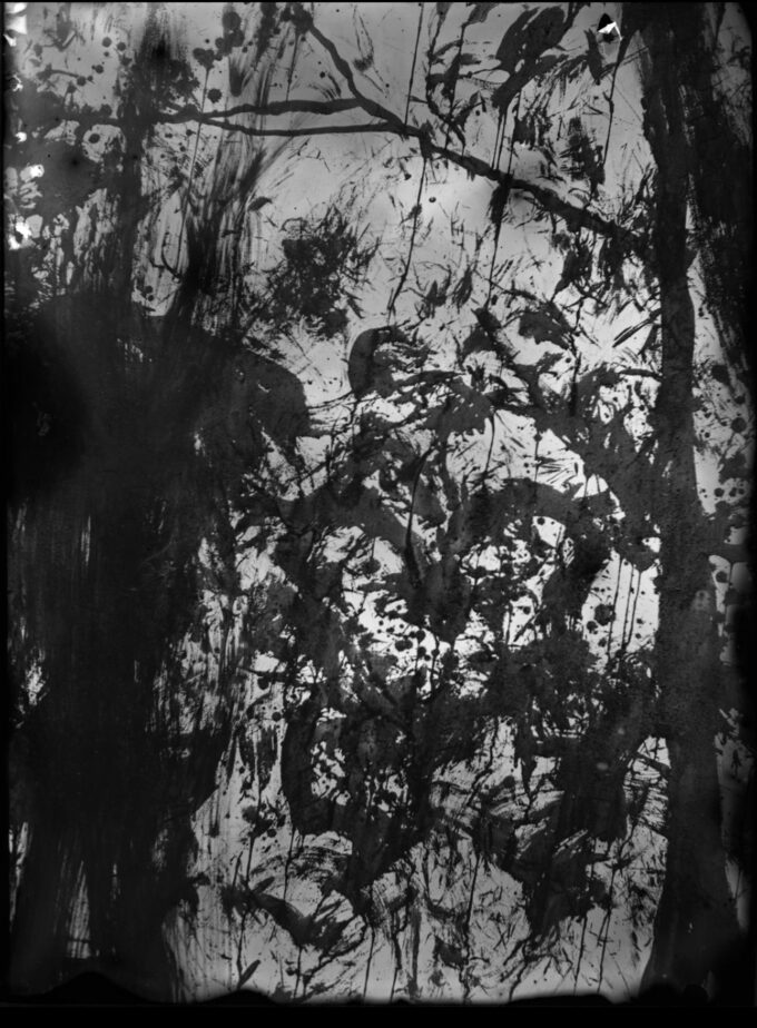 In quello stesso bosco, le fotografie su lastra di Devon Schoemaker hanno preso forma per restituirci il gesto dell’artista. Le fotografie non nascono per documentare quello che è accaduto nel bosco, ma per trasformarlo a loro volta, per mezzo dello sguardo e della luce. Esse aggiungono un capitolo a quella metamorfosi, prendendo parte a un processo creativo in cui la collaborazione non avviene più solo tra specie diverse, ma anche tra diversi medium artistici.