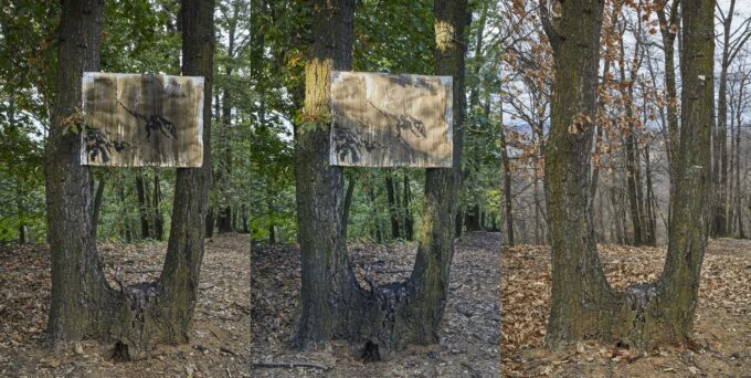 Immaginiamo di camminare in un bosco e di imbatterci in qualcosa che, a prima vista, non sembra appartenere a quel luogo. Notiamo subito che si tratta di grandi fogli di carta. Alcuni sono tesi tra due alberi, altri sembrano cingere i tronchi o pendere dai rami. Altri ancora giacciono al suolo, probabilmente caduti, ricoperti da fogliame e da piccoli mucchi di terra.