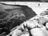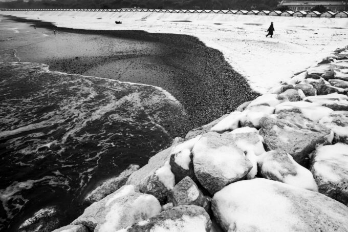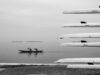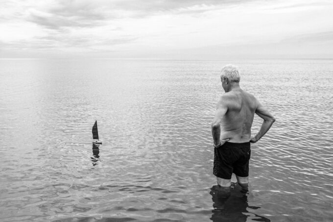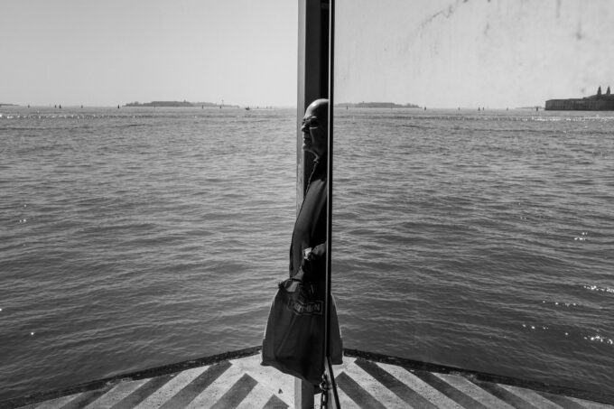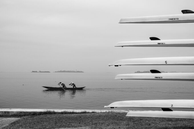 Sei scatti discretamente intrusivi fissano momenti di misteriosa, solitaria interrogazione umana della natura. Non c’è sfida più impossibile di trovare qualcosa che si è perso nell’acqua o nella sabbia, che sia un oggetto o un ricordo, una vongola piena o un’intuizione. Nell’ecosistema acquatico più antropizzato della storia – arginato, deviato, piegato alle esigenze dello “Stato da mar”, dell’industria petrolchimica e del turismo globale – la natura si nasconde e nasconde. Resiste e rispecchia, oppone silenzio alle nostre domande sul senso della vita, ma collabora alla vogata. Solo attraversamenti quotidiani, scanditi dalle abitudini di un cane, consentono di cogliere quei sublimi e disperati momenti di dialogo tra umano e non umano che regala l’essere dove, a Venezia.